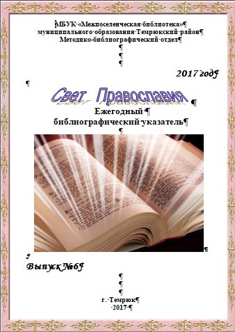 Ежегодный библиографический указатель «Свет Православия» включает в себя информацию о книгах и статьях из периодических изданий по теме «Распространение и развитие Православия на Таманском полуострове». Кроме того, список дает краткие сведения о наиболее значимых событиях и фактах по представленной теме. При его составлении использованы материалы из фонда Межпоселенческой библиотеки.